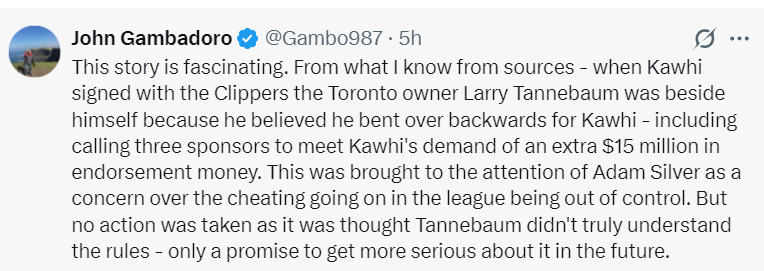 猛龙记者John Gambadoro:2019年夏科怀-伦纳德在决定自由球员去向签约快船之前,曾要求多伦多猛龙老板拉里-坦恩鲍姆为他争取额外1500万美元的代言收入。猛龙老板坦恩鲍姆还亲自联系了三家赞助商以满足科怀提出的额外1500万的代言费,这件事引起了萧华的注意他一度很担忧,但联盟并没有采取任何的行动。